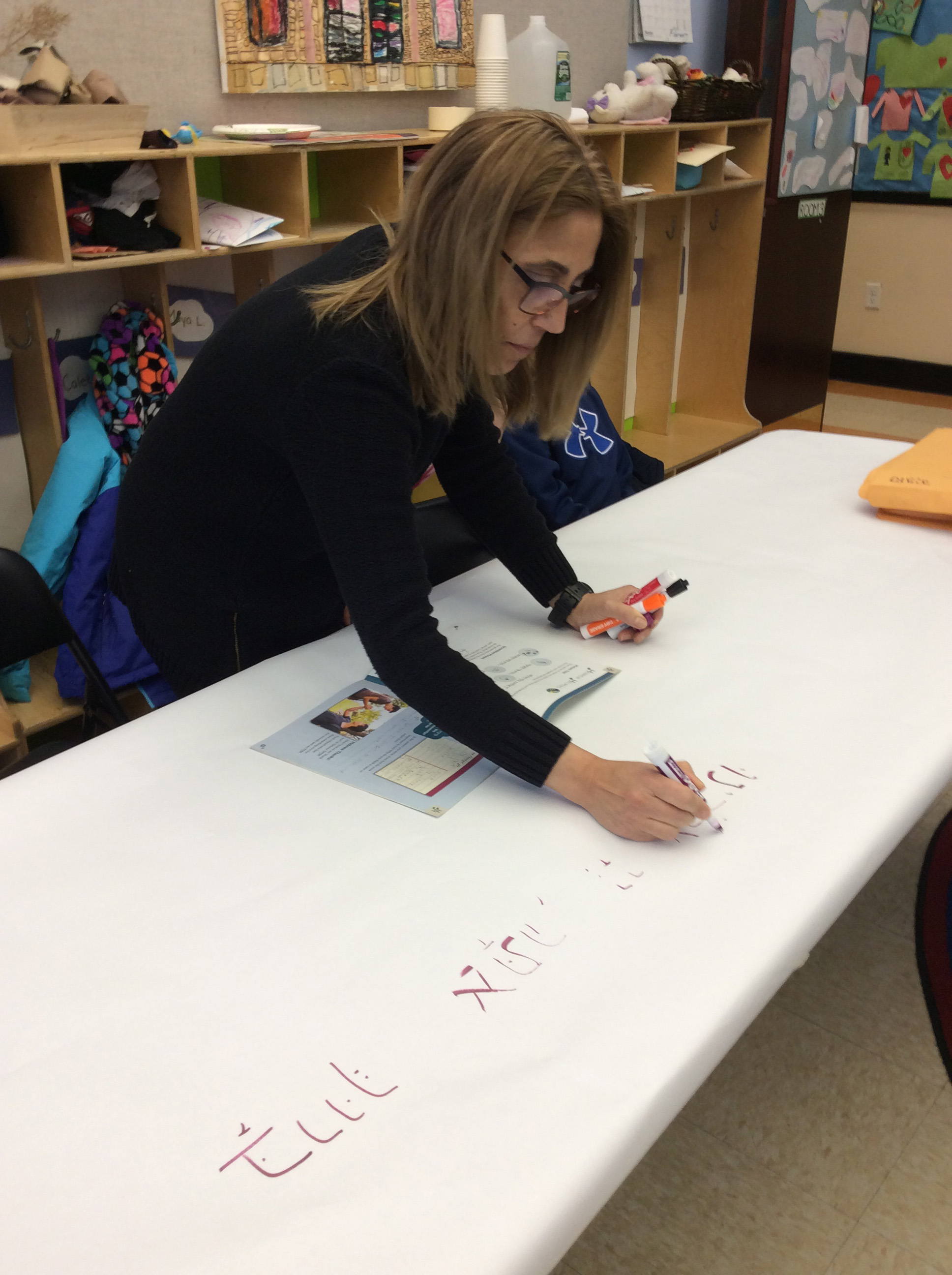 - Yael had prepared stations for the students with selections from prayers and blessings written on white paper “tablecloths.” She likes the kids to see different Hebrew fonts including handwriting. It also helped guide the children to the table or area where they should sit.